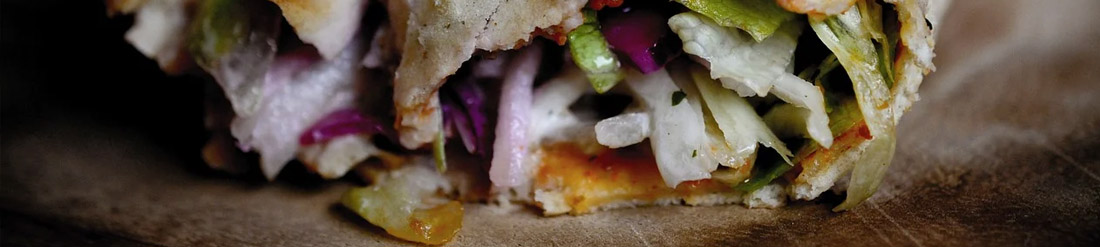 DER FALAHMACUN knackig gebackener Salzteig (Dürüm) mit einer traditionellen vegetarischen Lahmacunsauce gefüllt mit Kichererbsenbällchen, Eisbergsalat, Tomate, roten Zwiebeln, Rotkraut, Gurke, Peperoni und Tomatensauce